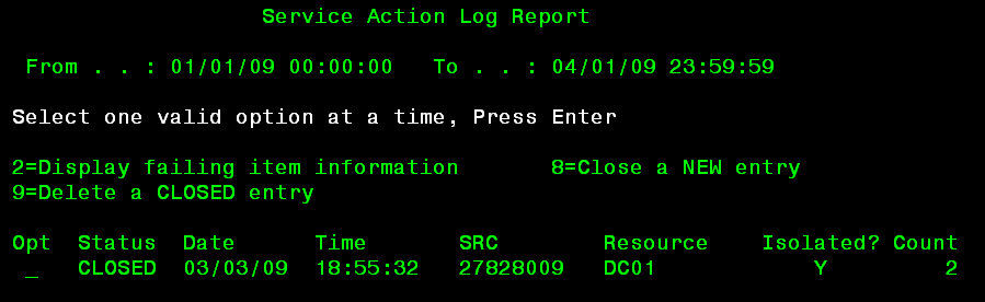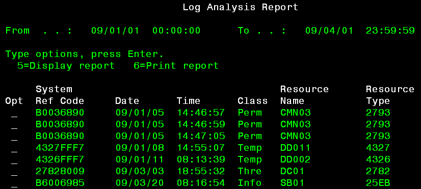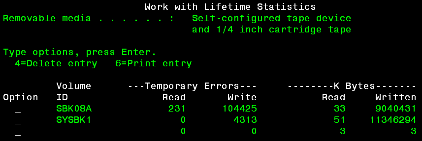 用security officer帐户(QSECOFR)登录系统,按以下步骤操作。 硬件检查 1、 命令STRSST进入系统维护界面,查看硬件报错信息。 在命令行键入命令STRSST,输入SST的用户名和密码,依次选择菜单,查看硬件日志: 1. Start a service tool => 7. Hardware service manager => 6. Work with service action log 再输入查看日志的时间区间,结果如下: ![]() 如果硬件出现故障,会在报告中出现,用2显示具体的内容,再进行故障排除。 如果硬件故障已解决,请用8关闭该信息报告。 2、 在SST系统维护界面,进行硬件日志分析。 退到SST主菜单,依次选择菜单进行硬件日志分析: 1. Start a service tool => 1. Product activity log => 1. Analyze log 再选择Log类别为1=All logs和时间区间,再按两次回车进行日志分析,结果如下: ![]() 在系统参考代码前用5查看详细内容。 3、 在SST系统维护界面,进行磁带寿命检查。