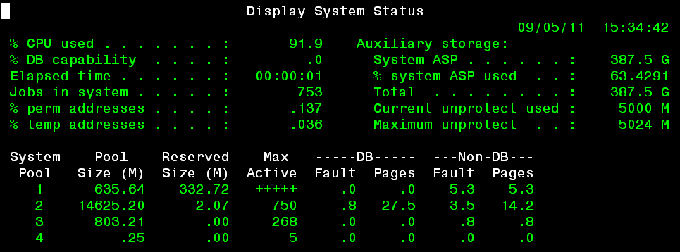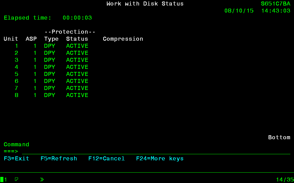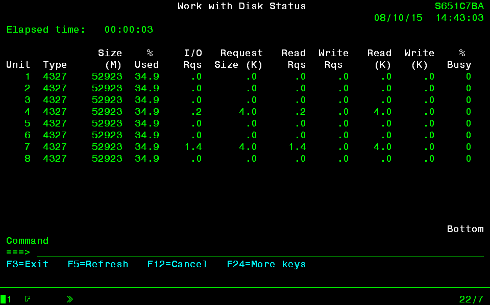 退到SST主菜单,依次选择菜单进行硬件日志分析: 1. Start a service tool => 1. Product activity log => 4. Work with removable media lifetime statistics 再选择磁带类型进行磁带寿命检查,结果如下: ![]() 系统配置检查 4、 命令WRKLICINF查看主机系列号和操作系统版本 ![]() 查看System serial number和操作系统版本(PRODUCT:5722SS1,FEATURE:5050的版本)。 5、 命令DSPSYSSTS查看系统的状态 ![]() 内存大小为pool size大小的总和,System ASP为硬盘有效空间,ASP used 为数据占用率。CPU的使用率保持在80%以下;ASP使用率建议在80%以下,如果超过90%,应采取强制措施清除无用或不常用数据,否则可能会导致主机宕机。 6、 命令WRKCFGSTS查看磁带机/带库状态 用命令WRKCFGSTS *DEV TAP* 查看磁带机或带库的状态,状态VARIED ON为正常,Varied Off / Rcypn / Failed状态表示有故障或不可用。画面如下: ![]() 7、 查看系统安全级别(System security level) 用命令dspsysval qsecurity查看系统安全级别,安全级别应当在30以上。 ![]() 8、 命令NETSTAT查看网络状态 用命令netstat *ifc查看网络状态,Interface Status正常状态为Active。 ![]() 9、 命令PING测试网关是否丢包 用命令 ping rmtsys('IP Address')测试网关是否丢包。 ![]() 10、 命令WRKDSKSTS 查看硬盘的状态: