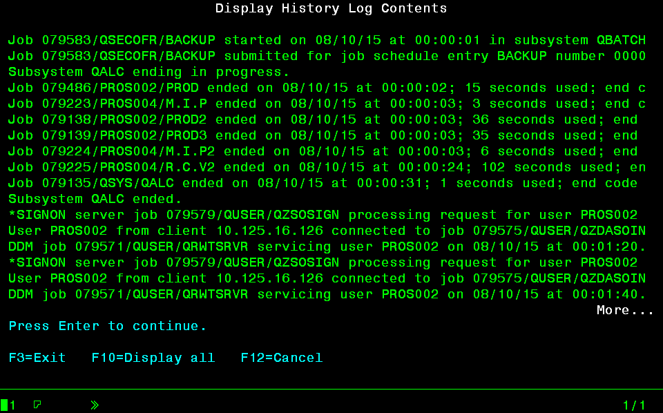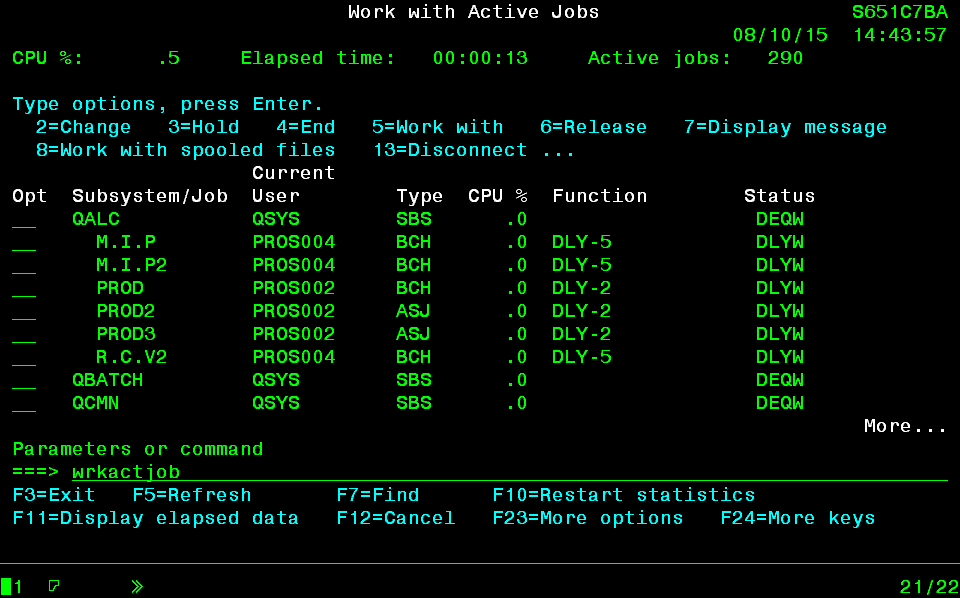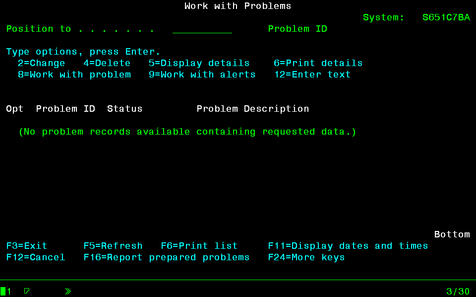按F5可以看硬盘I/O的繁忙程度(% Busy),比较理想的状态应该在40%以下。 ![]() 再按F11检查硬盘保护状态是否正常。 ![]() 状态ACTIVE为正常状态,DEGRADED为需要更换RAID电池。 类型DPY表示RAID5保护,MRR为镜像保护。 系统日志检查 11、 命令WRKPRB检查系统已发生的问题及潜在问题。 对出现的问题进行分析,如问题已解决或确认非故障请关闭Problem IDs。 ![]() 12、 命令WRKACTJOB检查系统活动作业 观察有无异常作业。例:如果Status的状态为MSGW表示有问题,与客户管理员一起解决。 ![]() 13、 查看系统日志 用命令dsplog查看系统日志,注意有关异常警告信息。 ![]() 14、 查看系统消息队列 用命令dspmsg qsysopr查看作业活动信息,特别注意需回复的信息。 ![]() 以上是检查AS/400主机系统运行状态及故障的常用方法,如有发现问题请记录下错误ID、错误信息和具体时间!