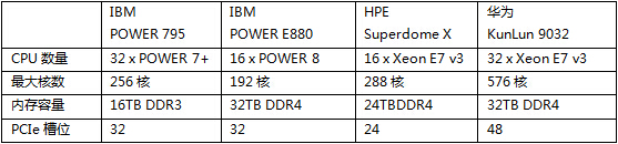 图3:SPECint和SPECfp测试值对比 从图3可以看出,华为KunLun 9032的整型和浮点计算性能分别是IBM E880的1.4倍和1.52倍;那么,真实业务场景下KunLun 9032性能到底如何? 我们都知道双11创下全球奇迹,对于银行来讲双11则是考验核心交易系统的年度大考之一,从IT角度解析,双11的线上支付流程实际上由两类交易组成:在线授权和后台清算,为了简化流程提升交易量,银行后台清算统一采用定时结算的方式,可以事后慢慢来,而授权实时性高,所见即所得。所以授权验证通过后,交易流程就完成了,而对于后台清算,并不包含在实时交易流程里面。就算流程已简化,某全球Top银行的核心交易系统也需要将TPS峰值提升至10000左右以保障成功交易(这个数据已经非常可观了,超过了VISA的TPS能力。实际上大部分的在线支付在支付宝充值账户内部即完成了,不需要经过银行交易系统)。 以银行交易系统10000TPS为参考,根据华为介绍,KunLun 9032以128核、4TB内存的配置运行DB 2单实例,按照某金融客户全业务场景测试TPS高达21000,此时CPU占有率也只有40%,而且据称该测试流程比双11要复杂,包括三方的授权验证和后台结算。 由此可以认为:KunLun 9032单机性能可以满足企业现在及未来数据库OLTP应用需求。 拒绝给64路戴上“高大上”的帽子 大多数人会认为,处理器数量越多,计算性能越高,稳定性越好,其实不然。技术发展趋势是通过提升CPU物理核数量而不是CPU数量来提升性能。32路Scaleup服务器足以满足企业关键业务对计算资源和性能的需求。 单颗CPU集成的物理核越来越多,IBM E880的POWER 8处理器物理核从上一代的8核提升至12核,E880虽然最大只支持16路但是性能比32路的POWER 795不降反升。而Inte Xeon E7 v4的核心数量也将从18核提升至24,单颗CPU性能增长达40%; NUMA(非一致性内存访问)架构的扩展效率并非是线性的,随着CPU互联数目越来越多,系统损耗将越来越大,超过32路以后,大大降低了投资回报率。 综上所述,笔者认为并不是处理器数量越多,越能体现其高价值,企业中的应用环境和特殊需求,导致产品形态的多样化,如何选择16路、32路还是64路的产品要结合企业实际需求而决定。