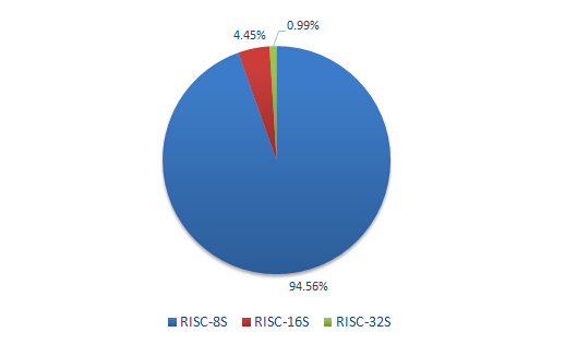 图1:2011年2015年8路以上RISC服务器全球发货量统计 2015年度,8S+ RISC服务器发货量主要以8路为主占据94.56%比重,16路持续增长2015年发货量占比达到4.45%,而32S RISC服务器发货量占比不足1%。如图2所示: